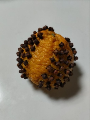 最後は、マイ農園だよりです。今年は柑橘類が不作です。デコポンも3つしかなっていません。そのうちの1個をとって、「フルーツポマンダー」という香りの置物をつくっています。先端のとがったクローブというスパイスを刺し、シナモン粉をまぶして、乾かします。完成を楽しみにしているところです。