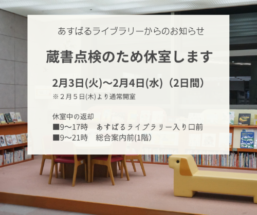 蔵書点検のため、あすばるライブラリーを休室いたします。期間は下記の通りです。