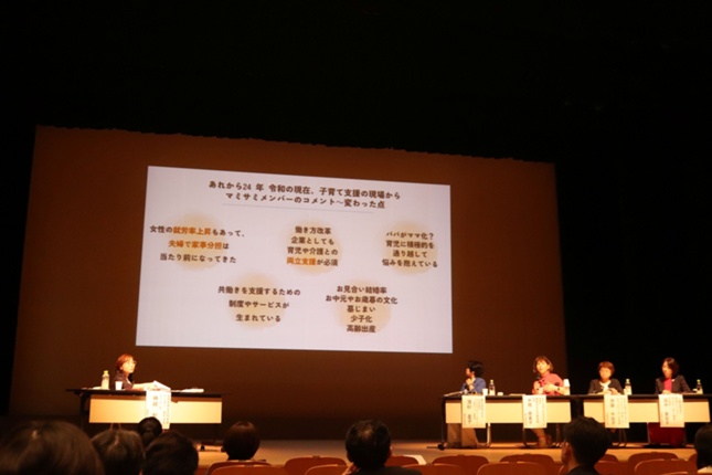 今年、新聞やSNSでは「さす九」(男尊女卑が根強く残るとされる九州地方を揶揄するもので、「さすが九州」の略語)という言葉が話題となりました。24年前に実施した男性の家事育児参画調査「果たして九州男児は存在するのか?」の結果を振り返るとともに、2025年に再度実施した同様の調査結果と比較して、変わった点や変わらない点、未来に向けた提言等をテーマに、福岡・香川・京都・宮城で男女共同参画推進に長年取り組んでいる皆さんによるパネルディスカッションが行われました。後半には質疑応答の時間もあり、パネリストのユーモアを交えたお話に、終始和やかな雰囲気に包まれた時間となりました。