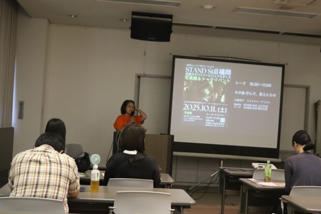 前半では、性暴力のサバイバーのために開催する写真撮影のワークショップ「STAND Still」の写真展が行われました。参加者は、写真はもちろんキャプションにも目を通し、熱心に鑑賞していました。後半ではワークショップの主催者であるフォトジャーナリストの大藪順子さんやワークショップ参加者のお二人から活動内容や想いについてお話しいただきました。参加者の皆さんからは写真に込められた思いを感じた、写真を通して自己を表現する大切さを知れた等の声が寄せられました。