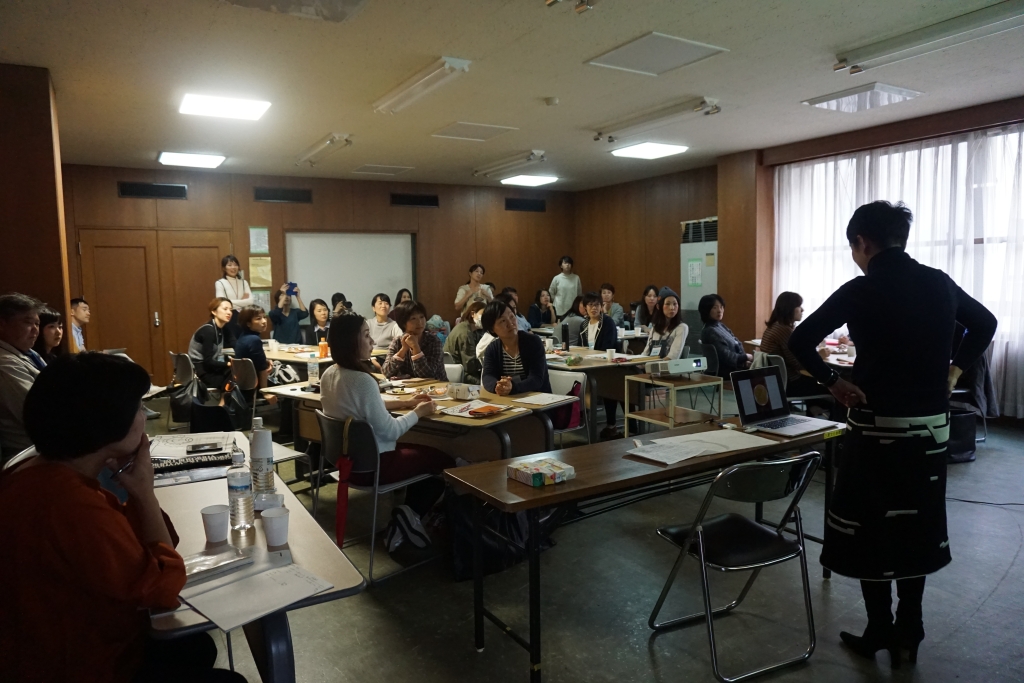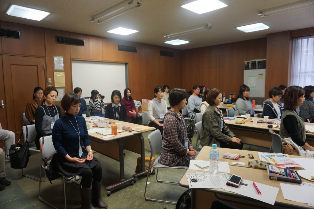 毎回の講座に組み込まれている保健体育の時間では、実行委員長の玉井由加里さんによるヨガの呼吸を取り入れたストレッチで、身体と心を整えます。