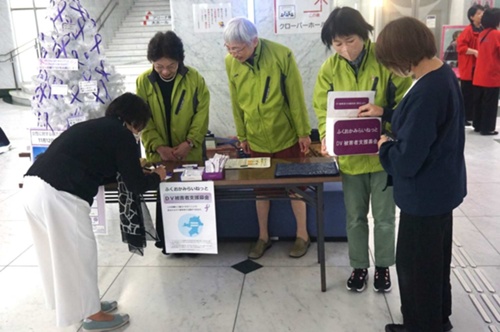 福岡県ジェンダー平等フォーラムやみらいねっとフォーラム、会員団体のイベント等において、パープルオレンジリボンピンバッジの販売・募金活動を行っています。収益金はDV被害者支援を行っている県内の民間支援団体に寄付しています。