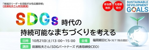 【どなたでも参加できます!】 地域のリーダーを目指す女性応援研修《特別講演》 「SDGs時代の持続可能なまちづくりを考える」「地域のリーダーを目指す女性応援研修」の第2回目 10月21日(土)に、SDGsのパイオニアとして世界でご活躍中の田瀬和夫さんを講師にお招きし、SDGs時代の持続可能なまちづくりについ...