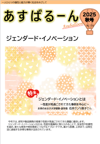 あすばるーん №118(2025秋号) ジェンダード・イノベーション 特集 ジェンダード・イノベーションとは ~性差が見過ごされてきた事例を中心に~ お茶の水女子大学理事・副学長 石井クンツ昌子さん あすばるーん秋号ダウンロード ※「あすばるーん」は、2025年度からオンライン配信のみとなります! 2025...