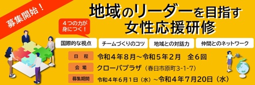 地域のリーダーを目指す女性応援研修について、お問合せが多かった項目を中心に動画にまとめましたので、ぜひご覧ください。 ご興味のある方・お申込みをお考えの方は、まずは「あすばる」事業推進課までご連絡ください。皆さまのお申し込みをお待ちしております。 申込 ❶募集人員 20名程度(選考の上、決定します) ❷募集...