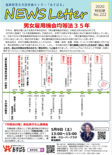 ニューズレター2020特別便を発行しました。 今年は、雇用の場における男女平等を定めた「男女雇用機会均等法」の制定35年の記念の年です 。 特別便では、男女雇用機会均等法の35年のあゆみについてまとめました。 ニューズレター特別便202003(男女雇用機会均等法) ※上記の赤松良子さん講演会は、新型コロナウイ...